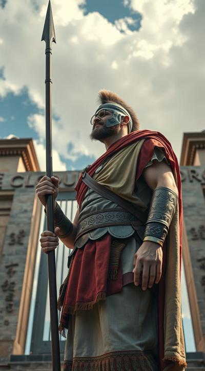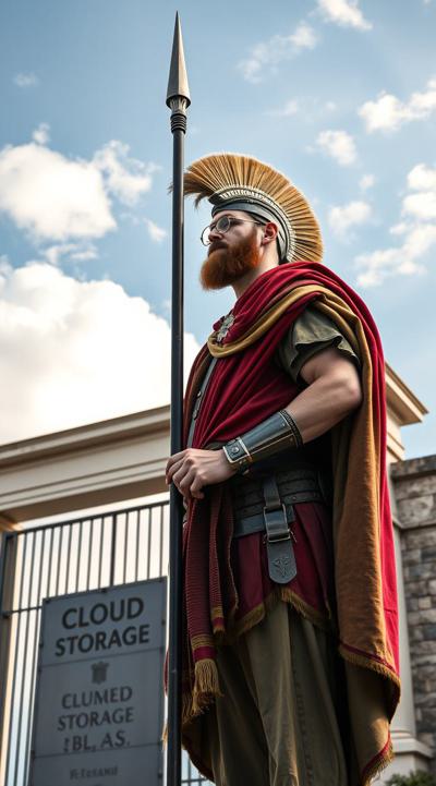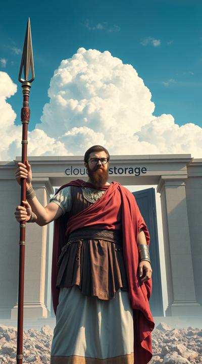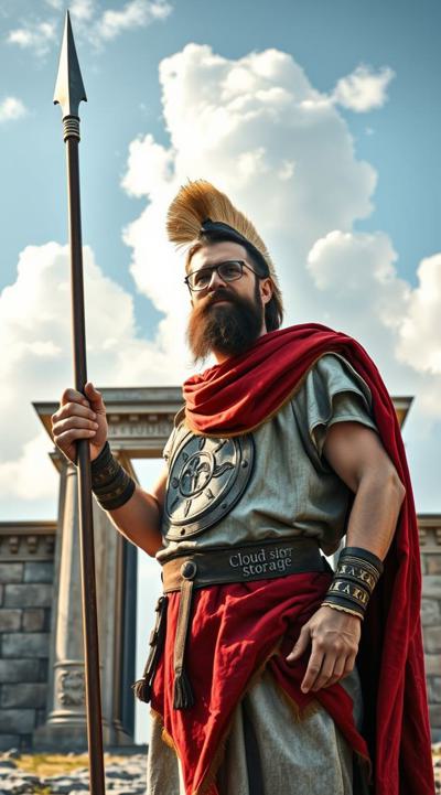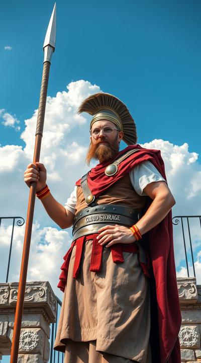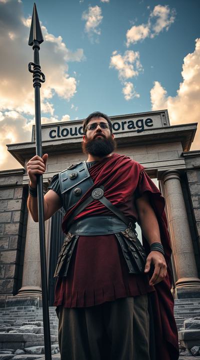Нарисуй мужчину с бородой и в очках в костюме римского легионера, стоящего на небе с копьём в руке возле ворот, надпись на воротах Облачное хранилище