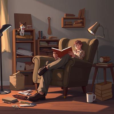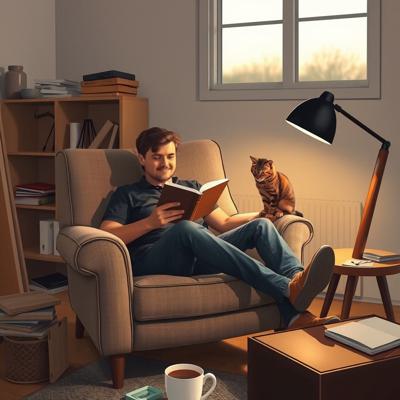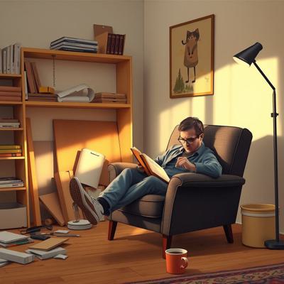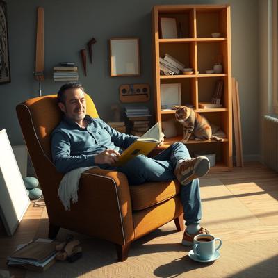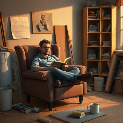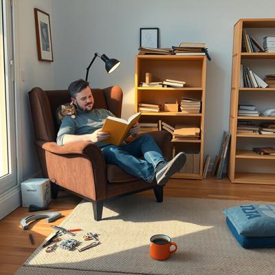 Мужчина сидит в кресле с книгой, на подлокотнике примостился ребёнок (или кошка). Рядом на полу — разбросанные детали конструктора, недостроенная полка, чашка кофе. Вечерний свет.,
