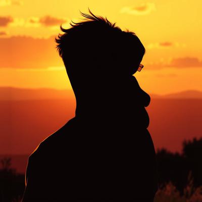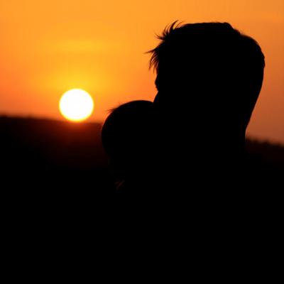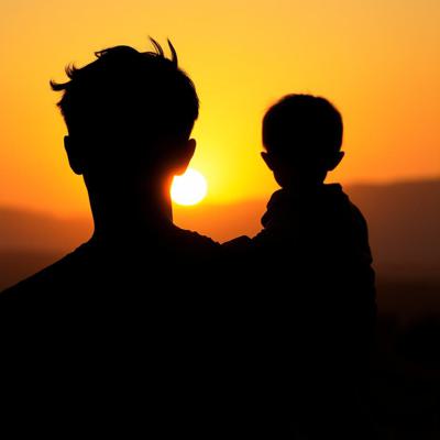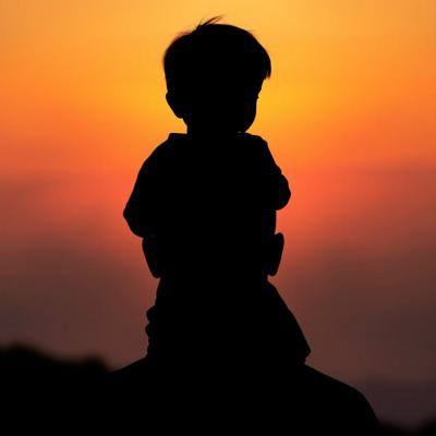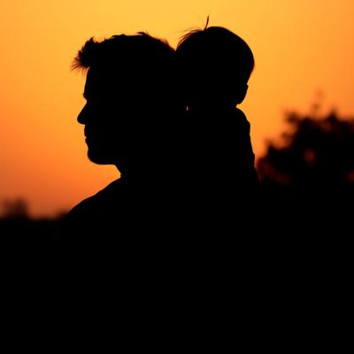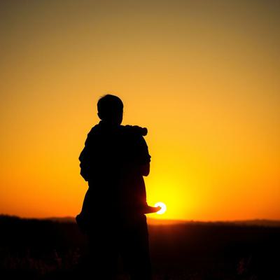 Силуэт мужчины с ребёнком на плечах. Они смотрят на закат. Без лиц, просто контур. Тёплые, оранжево-золотые тона