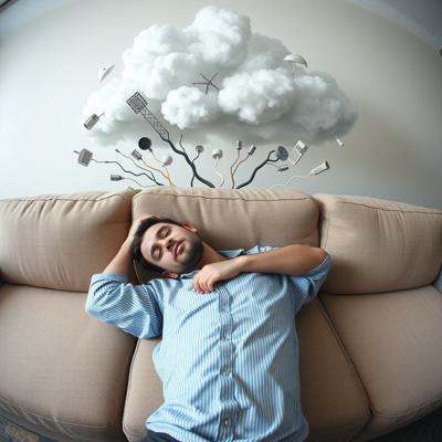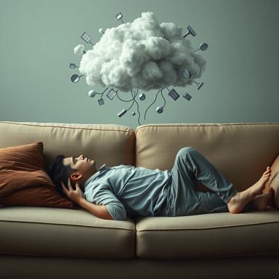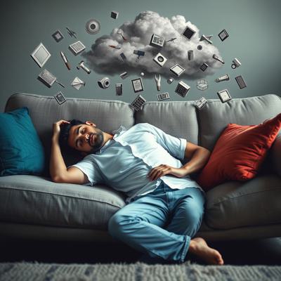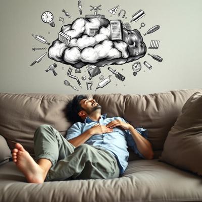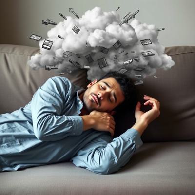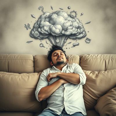 Человек в позе эмбриона лежит на диване а над головой облако хаотичных мыслей