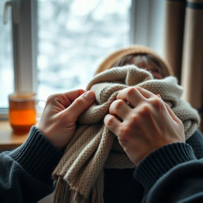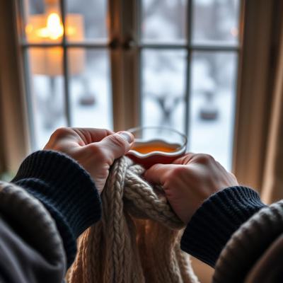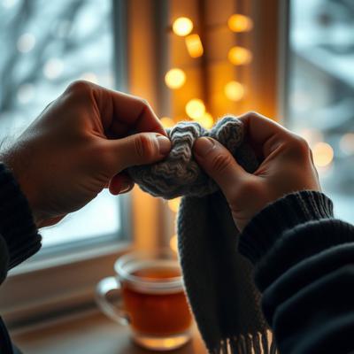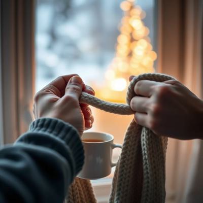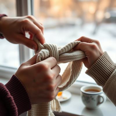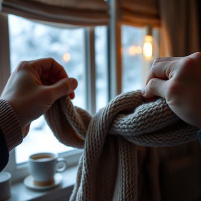 Мужские руки, которые завязывают шарф ребёнку (или женщине). Крупный план. Руки сильные, но бережные. Шарф мягкий, уютный. На фоне — размытый тёплый свет из окна, чашка чая, зима за окном., Настроение: забота, тепло, безопасность.