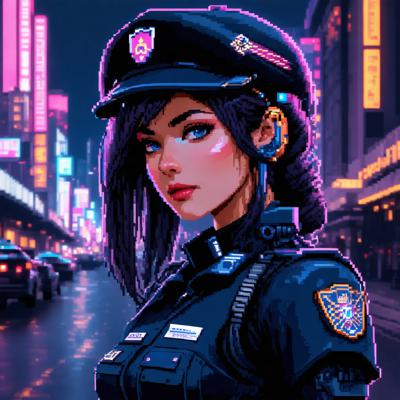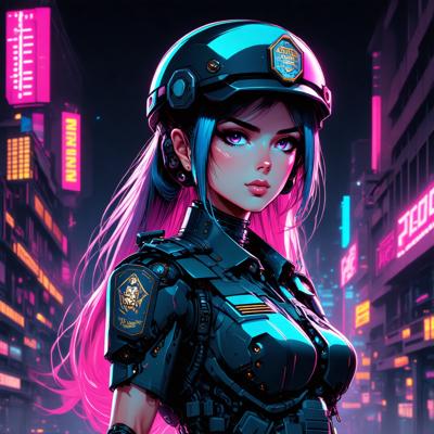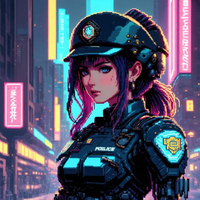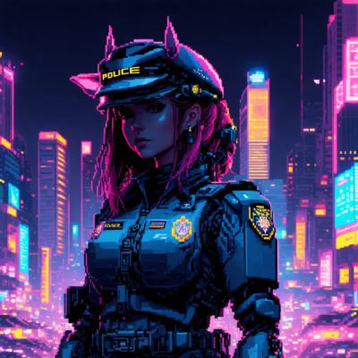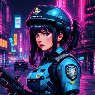 кентавр киборг девушка полицейская кентавр. киберпанк, пиксель арт, тушь, неон, мегаполис, ночь, ретровейв, аниме