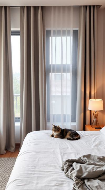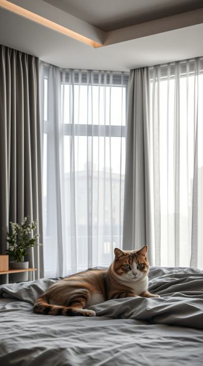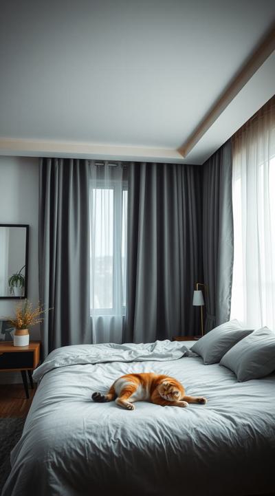 современный интерьер спальни серые шторы кровать на ней лежит кот