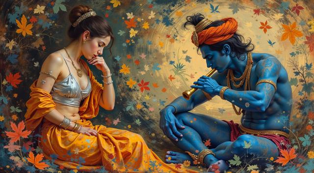 СРЕДНЕВЕКОВАЯ КАРТИНА ЖЕНЩИНА СПИТ СИДЯ СКЛОНИЛАСЬ НА БОК ОБЛАЧЕНА В СЕРЕБРЯННУЮ ПАРЧУ С ОРНАМЕНТАМИ ОБНО ПЛЕЧО ОГОЛЕНО НАД НЕЙ ИНДИЙСКОЕ СИНЕЕ БОЖЕСТВО ИГРАЕТ НА ФЛЕЙТЕ МЕЖДУ ЖЕНЩИНОЙ И БОЖЕСТВОМ АБСТРАКТНЫЙ ФОН В ВИДЕ СИЛУЭТА ЧЕЛОВЕКА С НЕБОЛЬШИМ БОБАВЛЕНИЕМ РАСТИТЕЛЬНОСТИ
