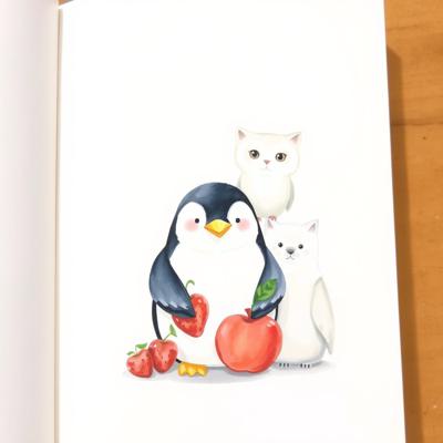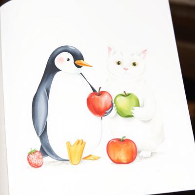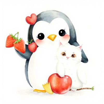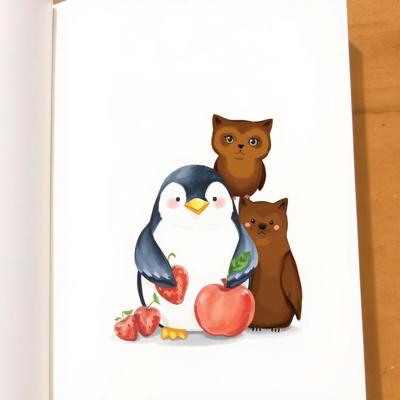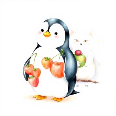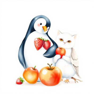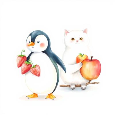 Акварельная иллюстрация. Пингвин с клубникой, белая кошка с яблоком и сова. Мягкие пастельные тона, нежные мазки кисти, белый фон с легкими тенями, стиль книжной иллюстрации, элегантно, минималистичная композиция.,