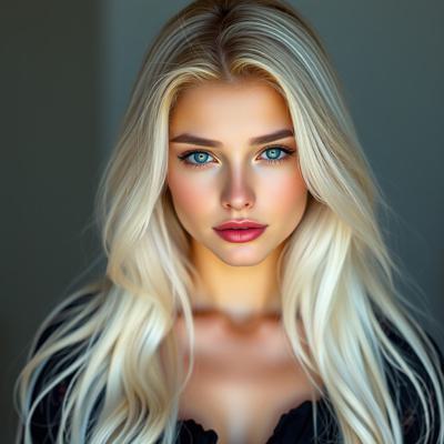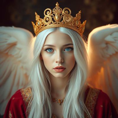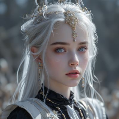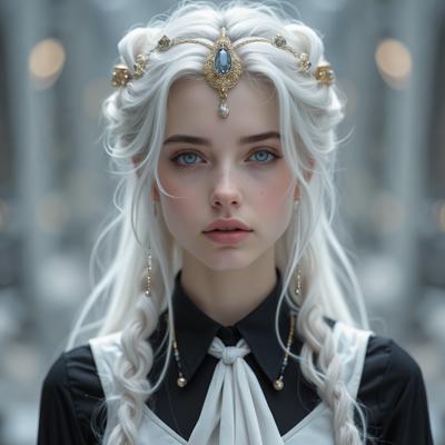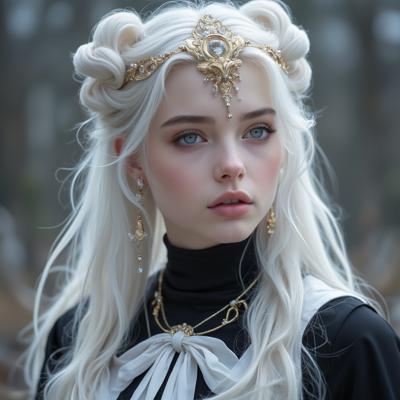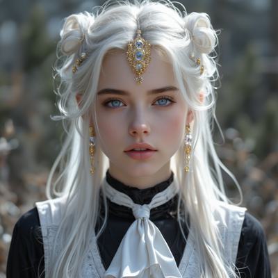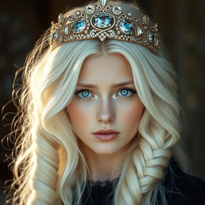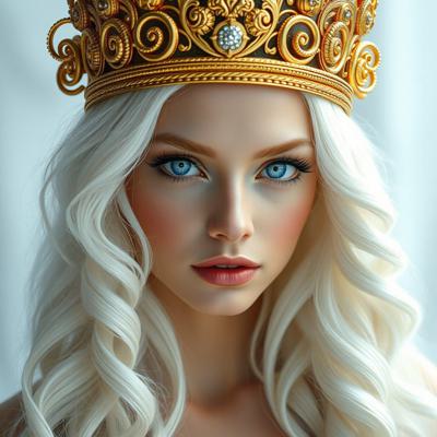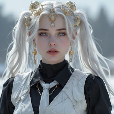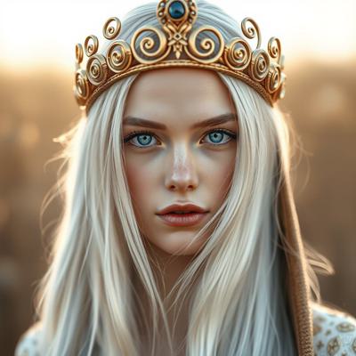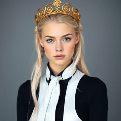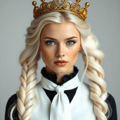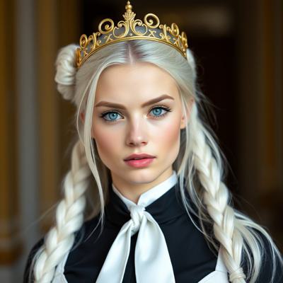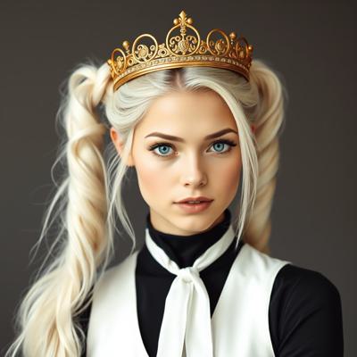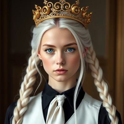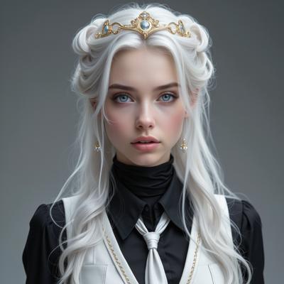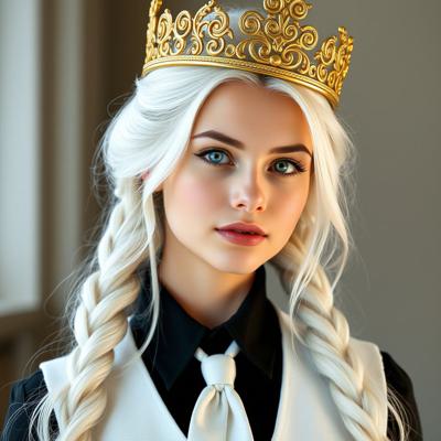Красивая молодая девушка славянской внешности, с длинными белыми волосами, собранными в два хвоста, и голубыми глазами. На голове — изящная золотая корона с завитками, подчёркивающая её статус. Одетая в чёрную облегающую рубашку и белый жилет, с аккуратно завязанным белым классическим галстуком. Поверх — лёгкий белый пиджак с широкими рукавами, развевающимися на ветру. Классические белые брюки подчёркивают стройную фигуру, на руках — чёрные кожаные перчатки до локтя. Минималистичные серьги и тонкий браслет на левой руке. В её взгляде читаются уверенность, харизма и лидерские качества. Стиль: фэнтези-реализм, детализированный портрет, мягкое освещение, высокое качество.
