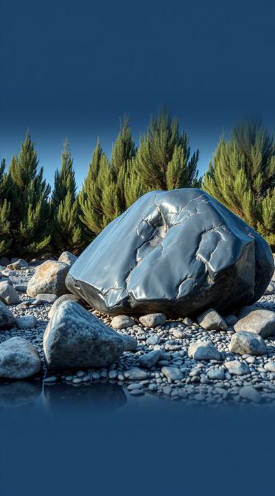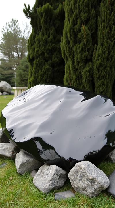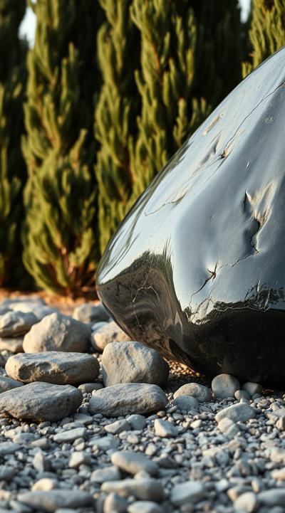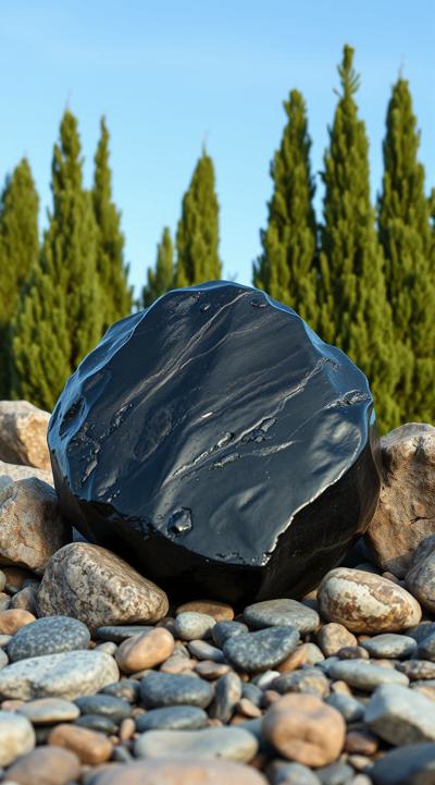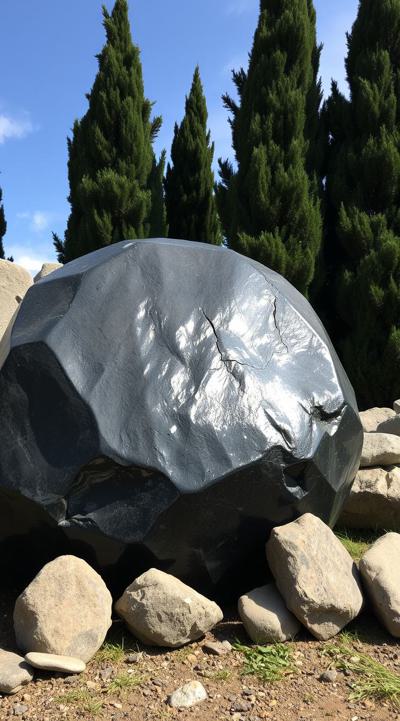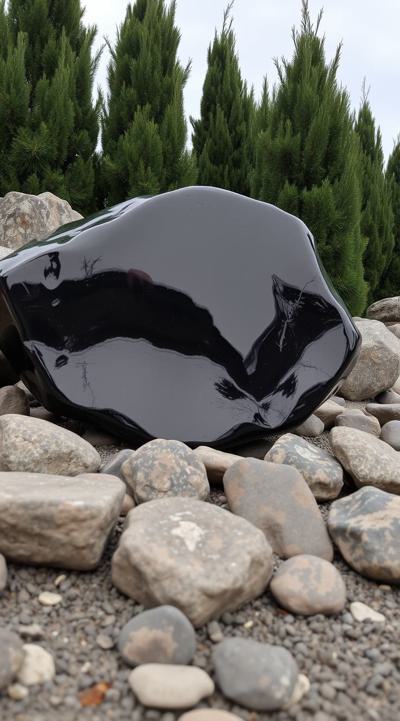 чёрный зеркальный большой камень, рядом с ним несколько небольших камней, на фоне кипарисы