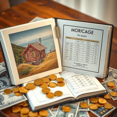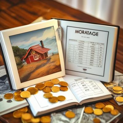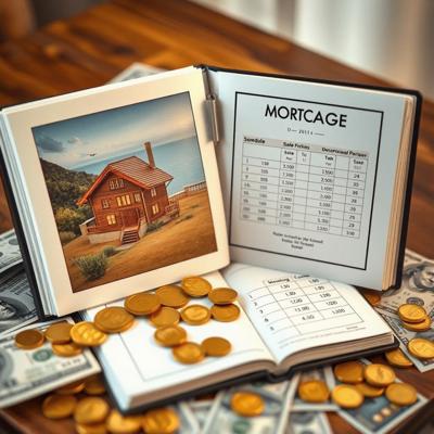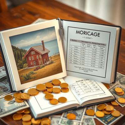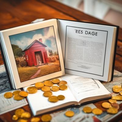 «Книга-сейф, лежащая на столе, открыта, на одной странице изображён уютный дом и море (Турция), на другой — ипотечный график, который уменьшается. Книга окружена деньгами и золотыми монетами. Уютная атмосфера, мягкий свет» [Вариации для #6277017 ]