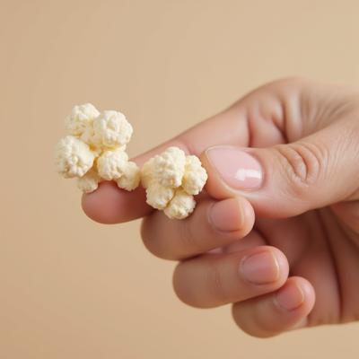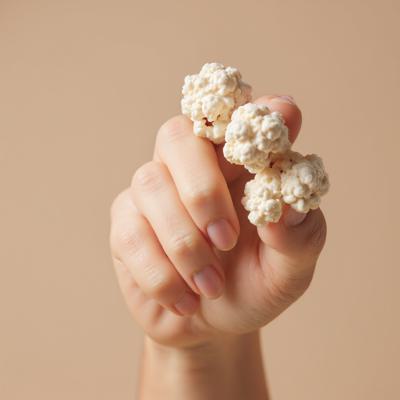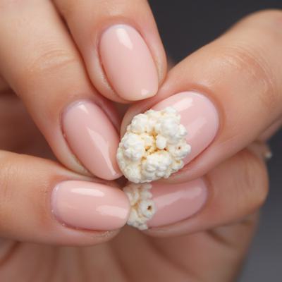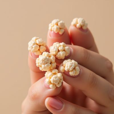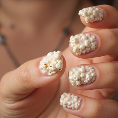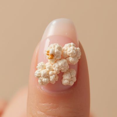 Macro shot of a hand. Each fingernail is sculpted to look like a large piece of buttered popcorn — puffy, irregular, rounded, with a rough textured surface. The gel has a soft milky pink color with glossy highlights. The background is neutral beige. Photorealistic, high detail, 8k.