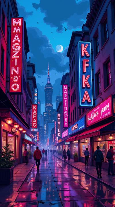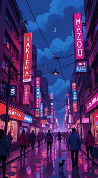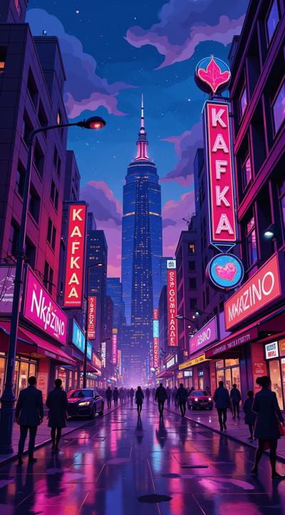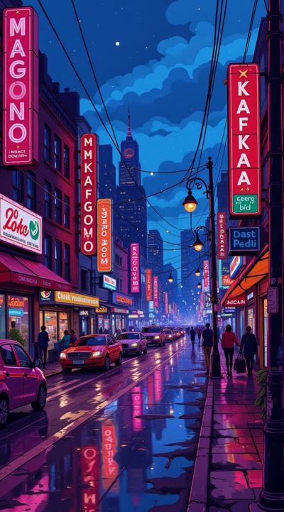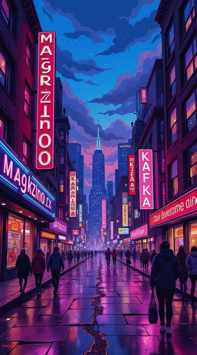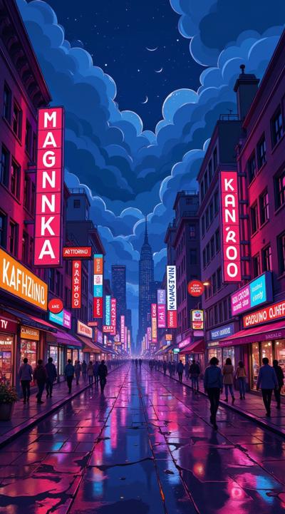 вечерний гоород улица переливается неоновыыми огнями,вокруг рекламные вывески магкзиноов и кафк