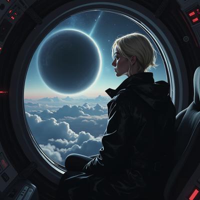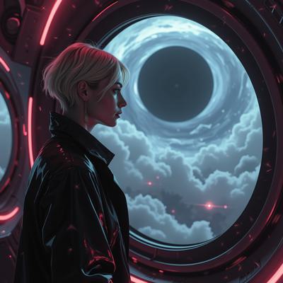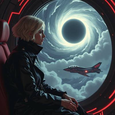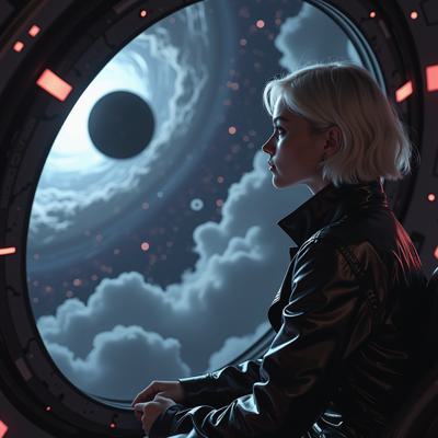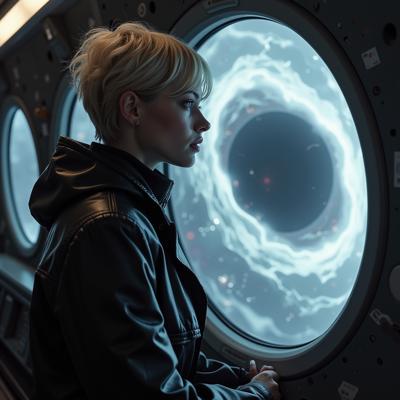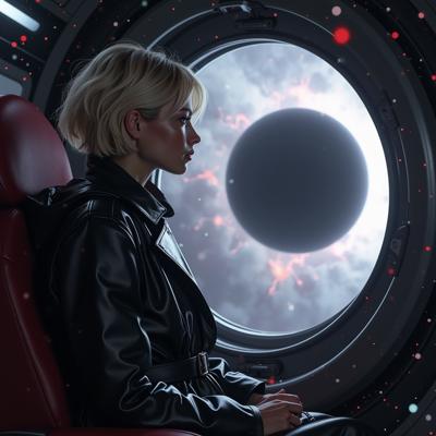 красивая блондинка с короткой стрижкой в черном кожаном плаще смотрит в окно футуристичного космического корабля, пролетающего мимо черной дыры