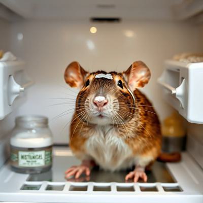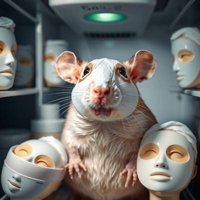 Крыса в холодильнике в увлажняющей масочке для лица и в окружении увлажняющих масок для лица