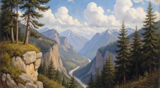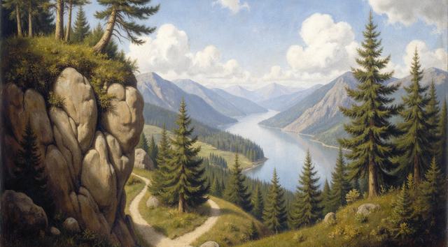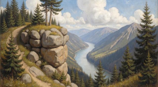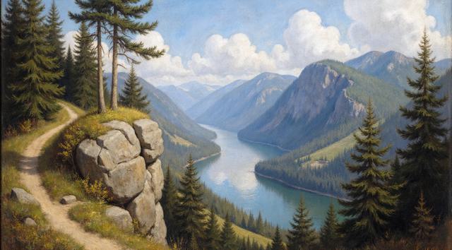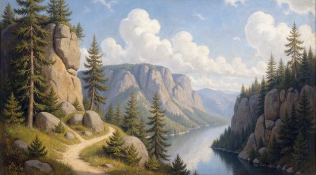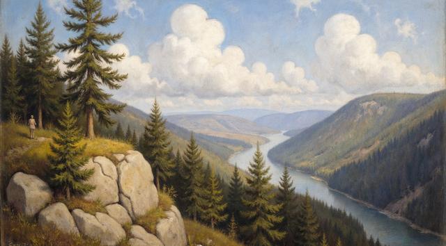 Вид с утеса на реку, русский пейзаж, сосны, солнечный день, сосны, холмы