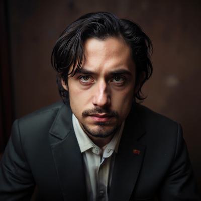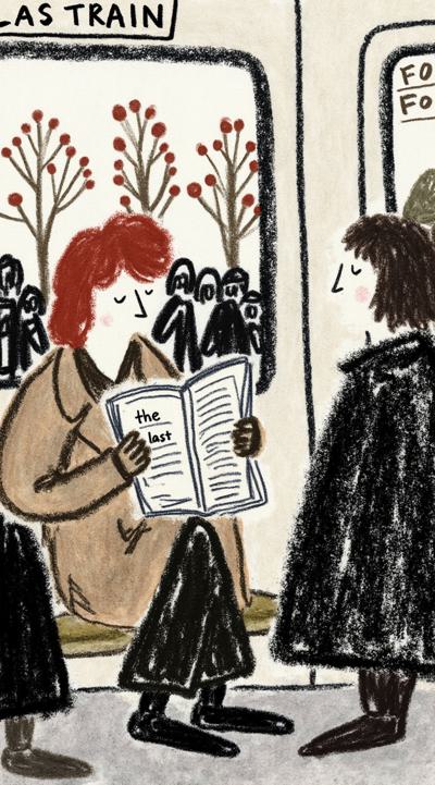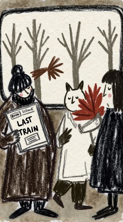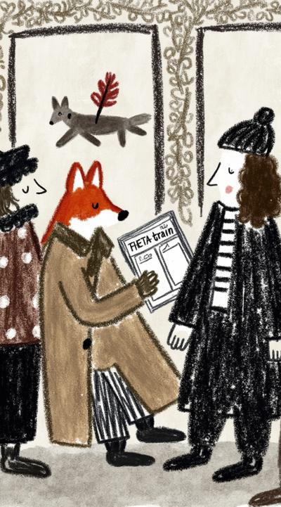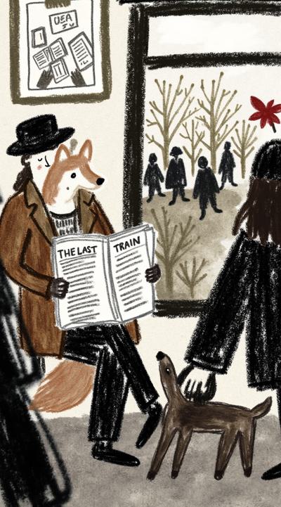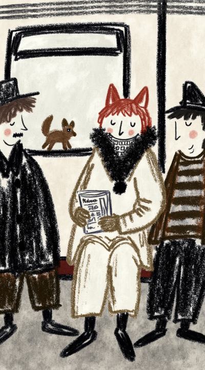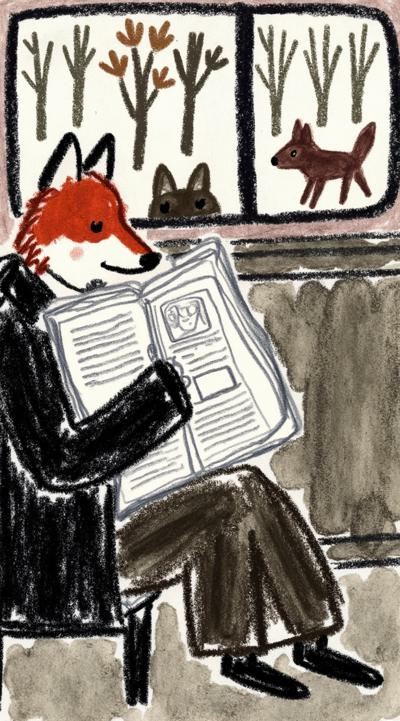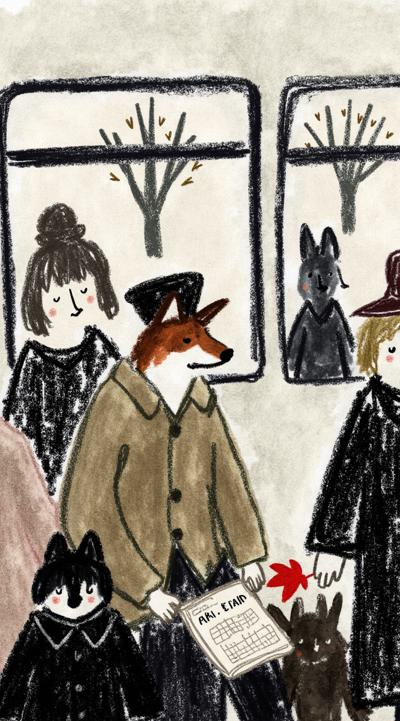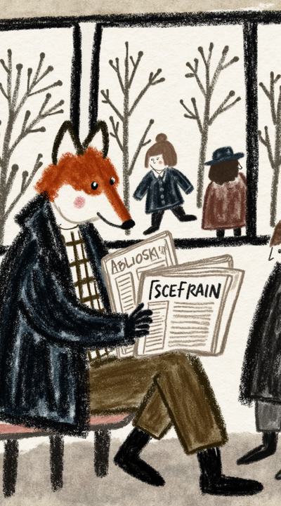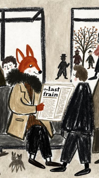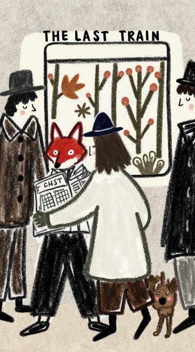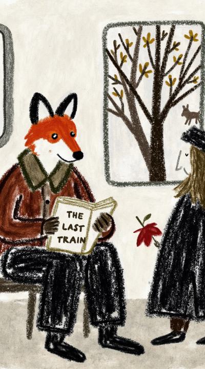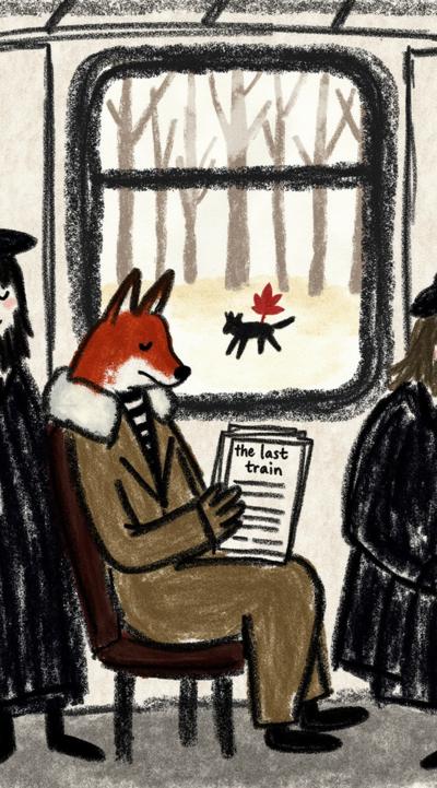 Лиса в тренче сидит в подземке, держит газету “Последний поезд”. Остальные пассажиры — размытые тени. В отражении на окне — она ребёнком бежит по осеннему лесу. Между лап — одна красная осенняя листва. Стиль филм-нуар, сюрреализм, меланхолия, чёрно-белое с одной красной деталью, кинематографично, 4K,