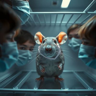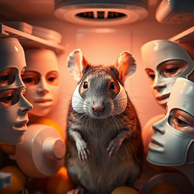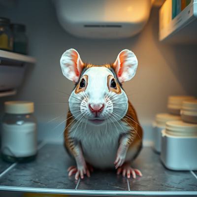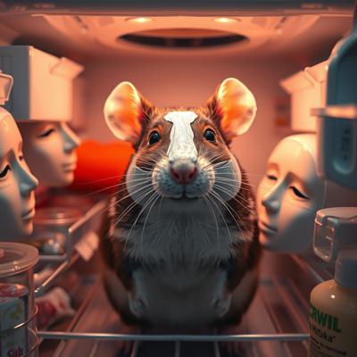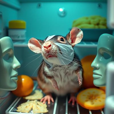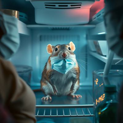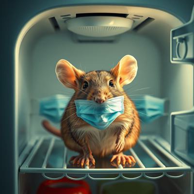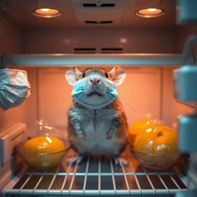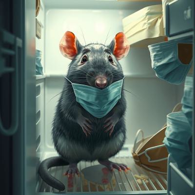 Крыса в холодильнике в масочке для лица и в окружении масок для лица