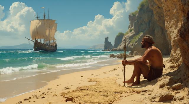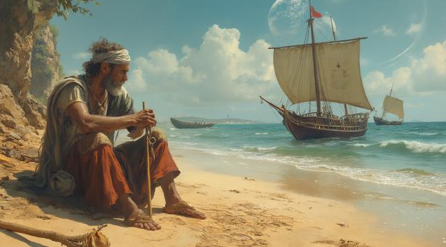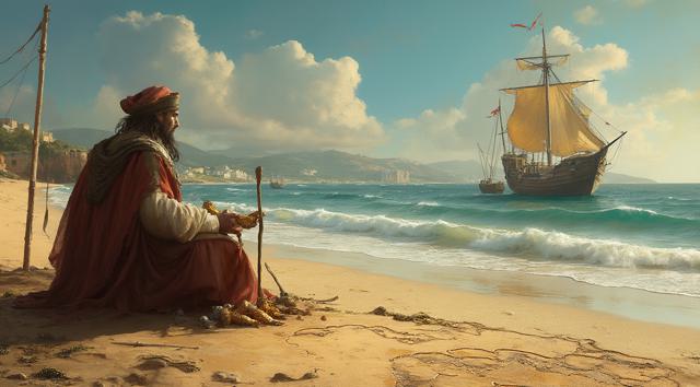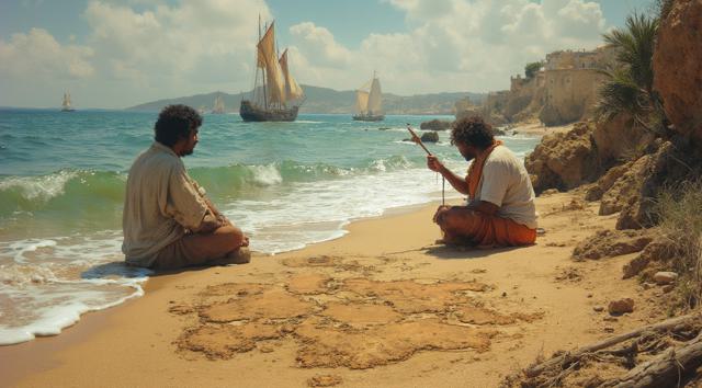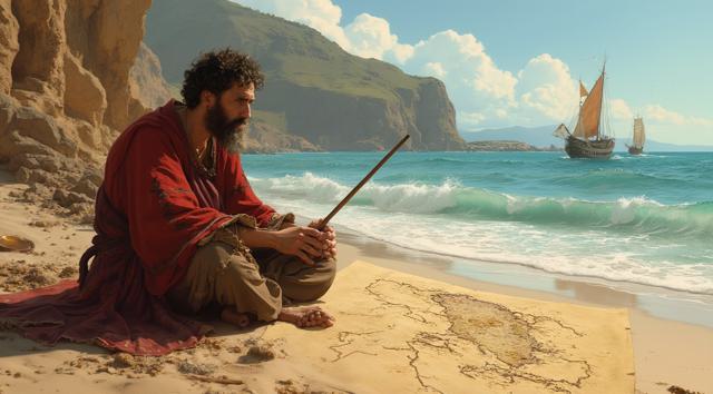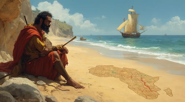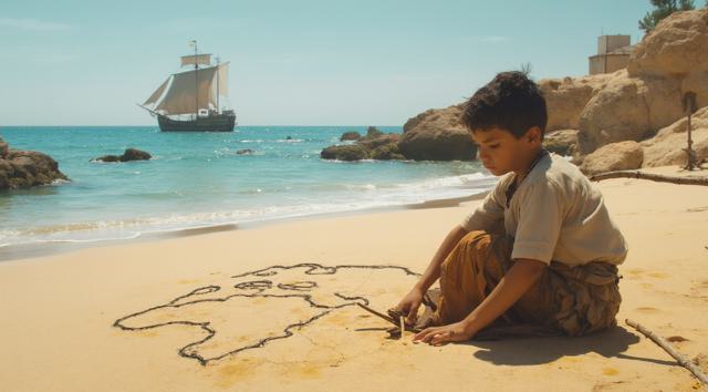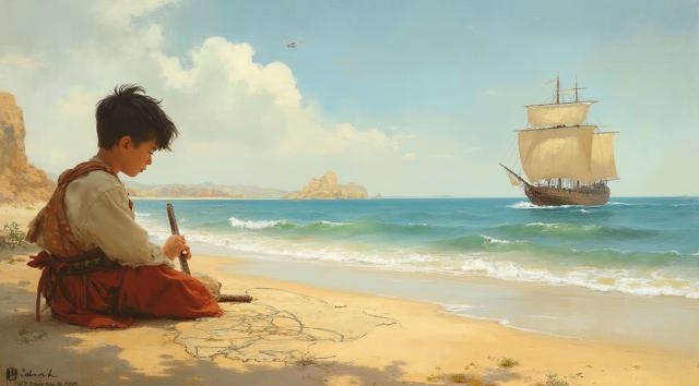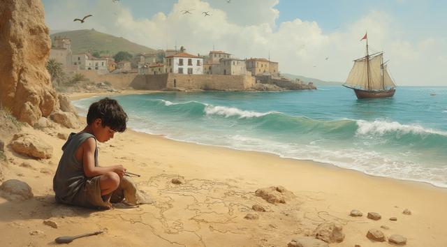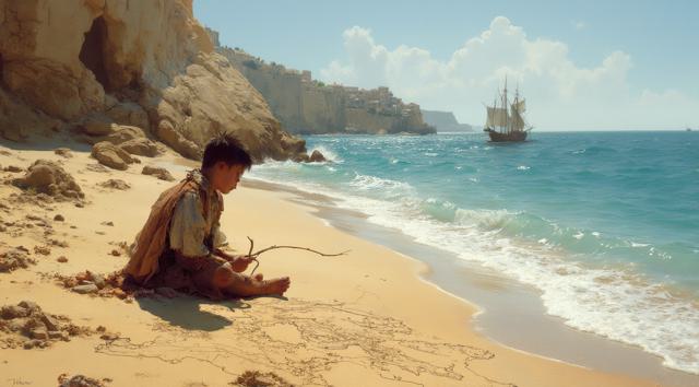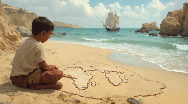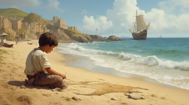 XV век. Португальский рыбацкий приморский городок Синиш. Юный мальчик сидит на берегу и палочкой он рисует на песке карту Африки. Вдали на море виднеется каравелла.,