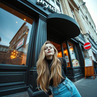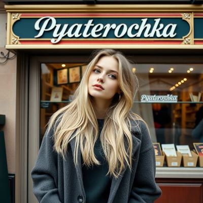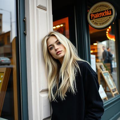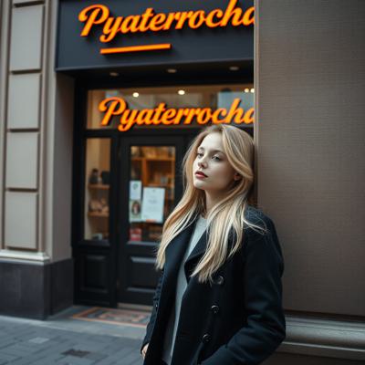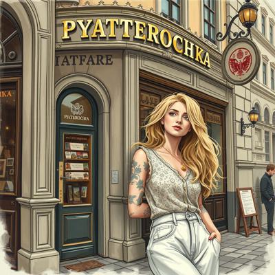 Создай изображение светловолосой девушки которая лениво лоблокотилась об фасад магазина Пятерочка