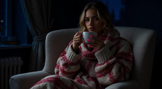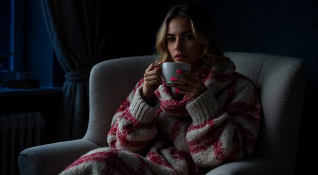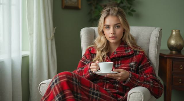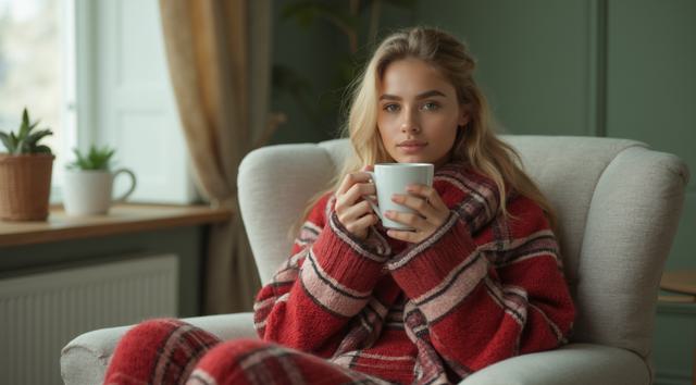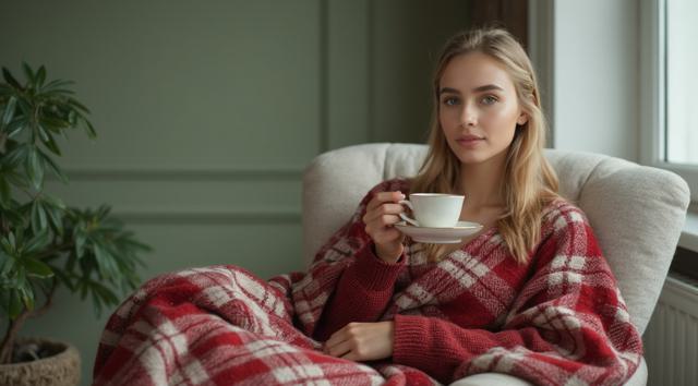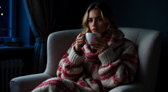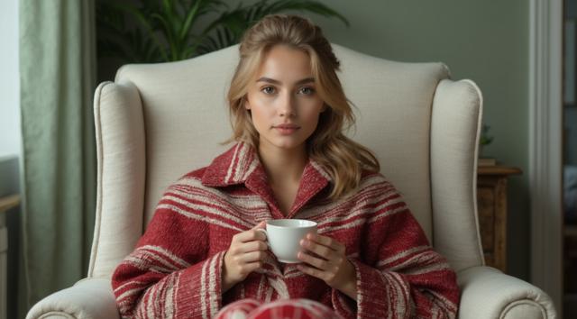 Девушка красивая славянка высокая 22 лет, грудь 3 размер красивое лицо; сидит укрытая в плед красно белый в белом кресле, укрыла ноги, а в руках попивая чай из чашки, сзади фон светлозеленых тонов стены спокойного дома, находясь внутри него, фото сбоку от нее чуть подальше она не смотрит в кадр а куда то в свою сторону будто не замечая фотку, свет приглушен. ФОТО СБОКУ ИЗДАЛИ МЕТРОВ С 7. ВРЕМЯ В КОМНАТЕ ВЕЧЕРНЕЕ ТО ЕСТЬ СВЕТ ПРИГЛУШЕН ФОН ЕСЛИ ОН ЕСТЬ ТЕМНЫЙ ЗА ОКНОМ [Улучшение крупных деталей ]