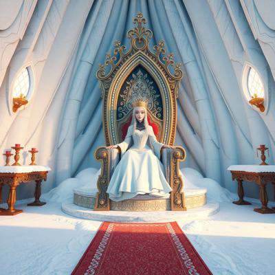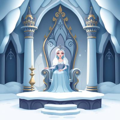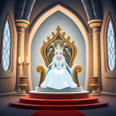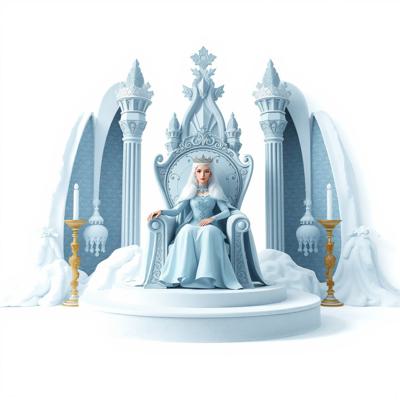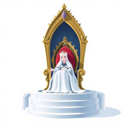 Создай вытынанку, где Снежная Королева сидит на троне. Снежная Королева должна быть похожа на Снежную Королеву из мультфильма Снежная Королева . Сама вытынанка должна быть чёткой и иметь белый фон.