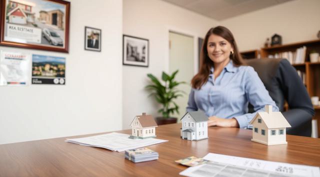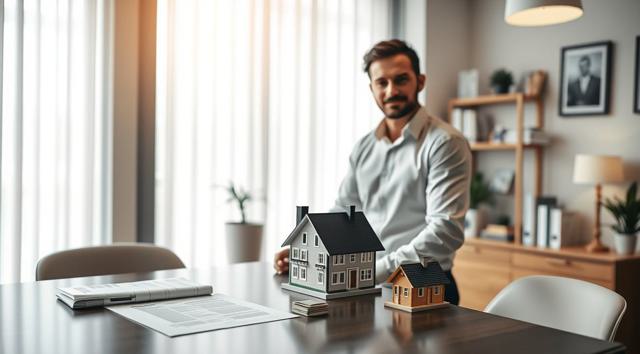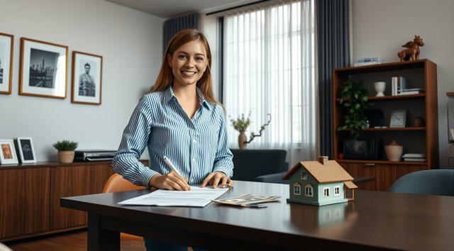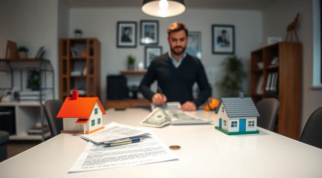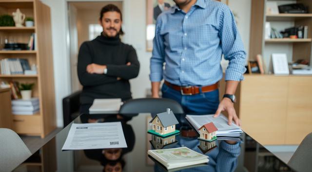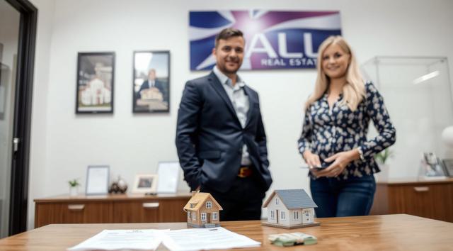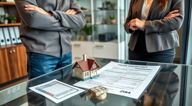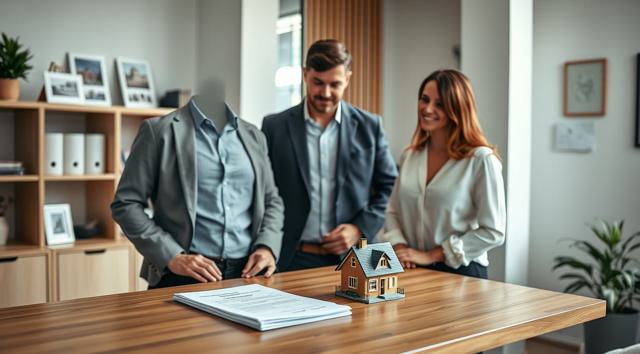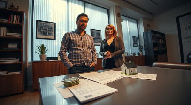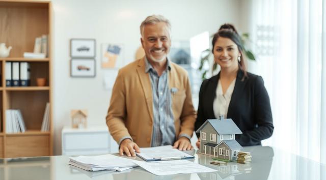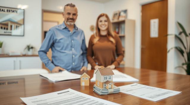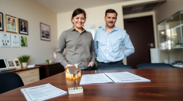 Мужчина и женщина стоят возле стола в офисе недвижимости. на столе лежат документы, расписка, маленькая стопка денег и фигурка домика.