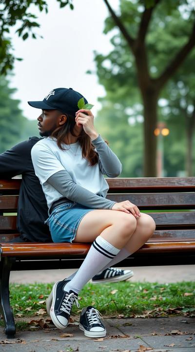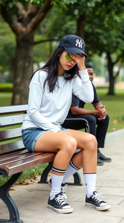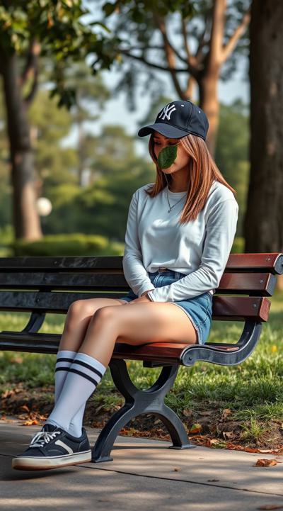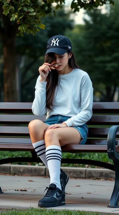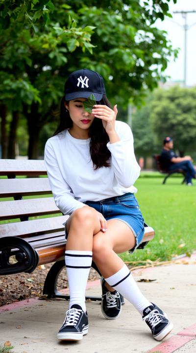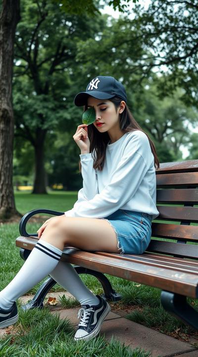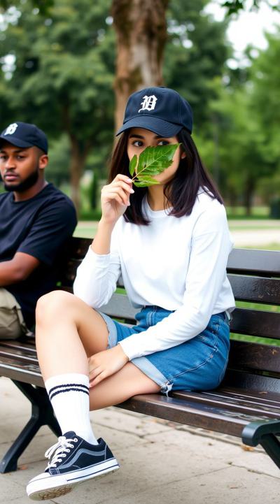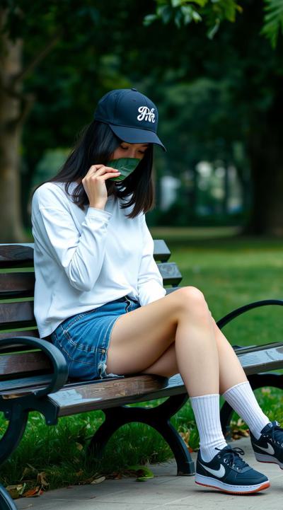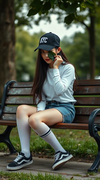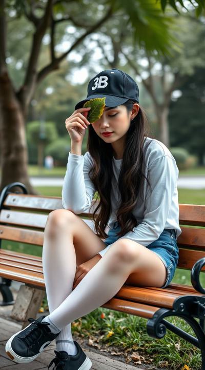 Девушка сидит на скамейке в парке, правый глаз прикрыла листком с дерева левым задумчиво смотрит вниз. Одета в белую футболку с длинными рукавами, синие джинсовые шорты, белые чулки с чёрными полосками, чёрные кроссовки, на голове чёрная бейсболка с белой надписью, рядом с ней на скамейке чёрный рюкзачок.