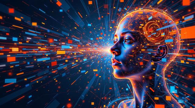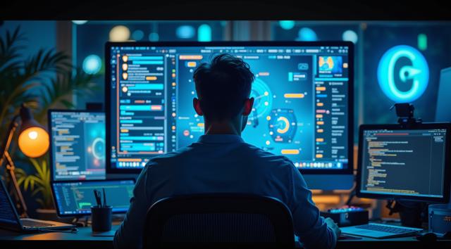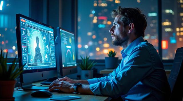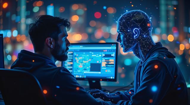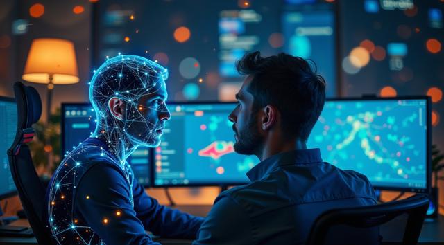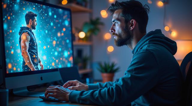 человек сидит напротив экрана компьютера, а оттуда на него смотрит его цифровой аватар ,