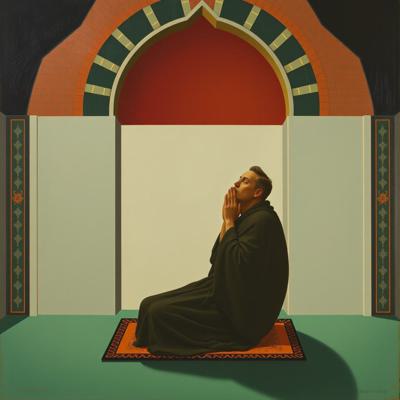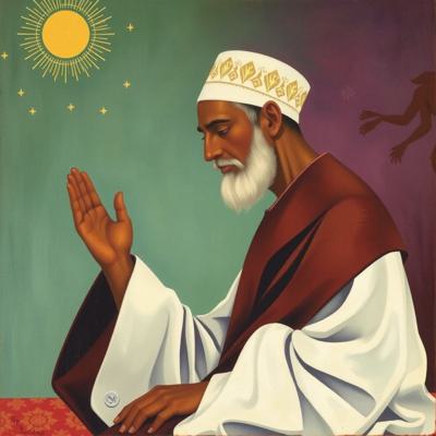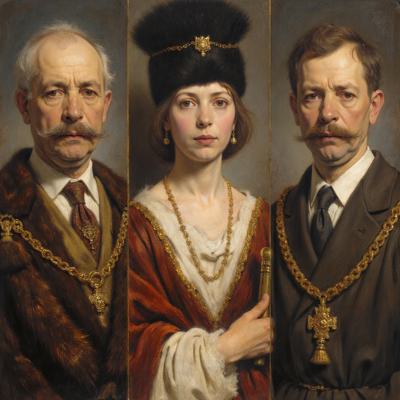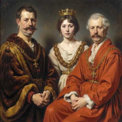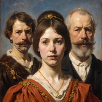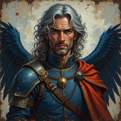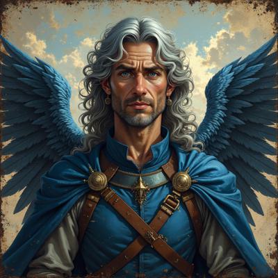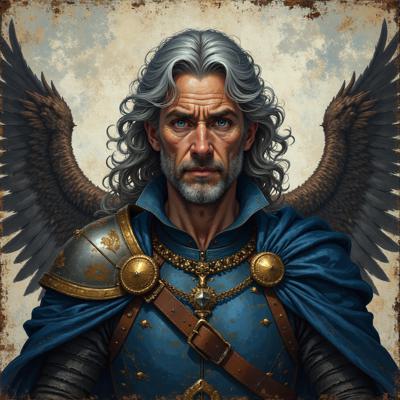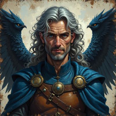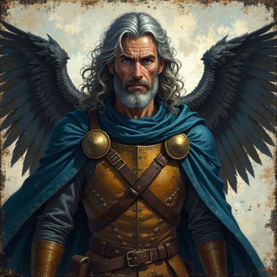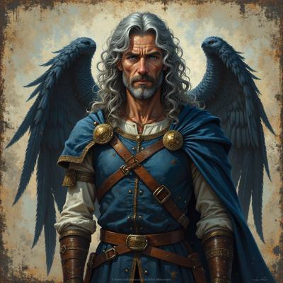 Мужчина в анфас по плечи. На однотонном потертом фоне. Мужчина. Возраст 60 лет. Длинные вьющиеся седые волосы. Голубые глаза. Добрый взгляд. Одет как средневековый воин. Крылья в цвет волос, аккуратно сложены за спиной, похоже на птичьи с перьями