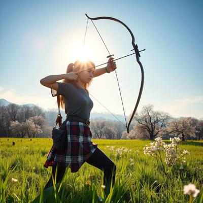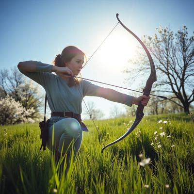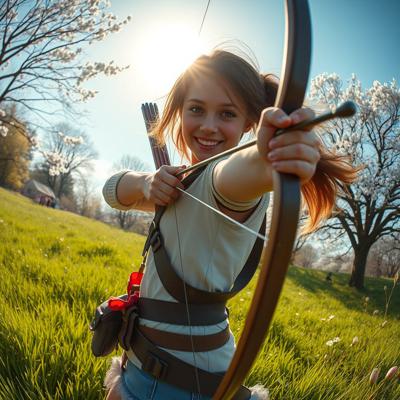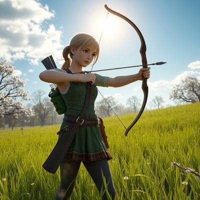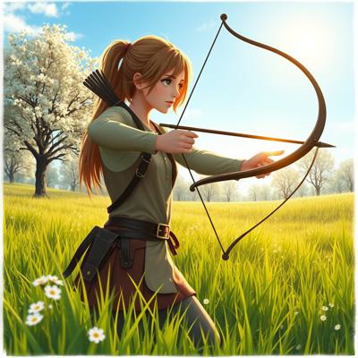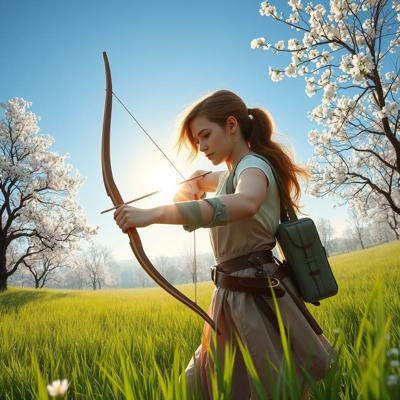 создать вариации молодая охотница с луком или арбалетом в весеннем пейзаже, светит солнце, зелень травы и цветущие деревья голубое небо, солнце Легкая дымка