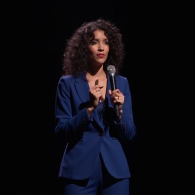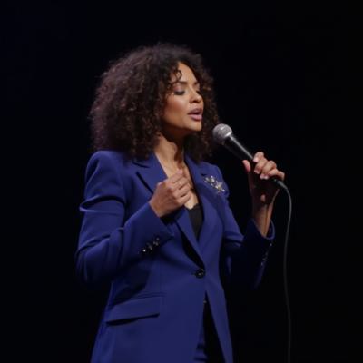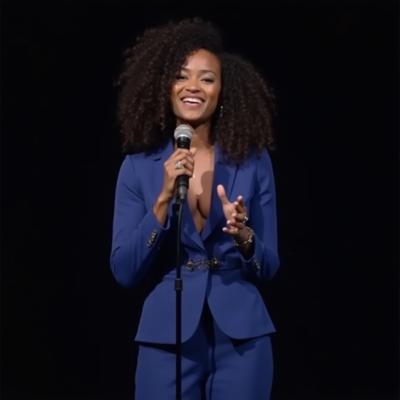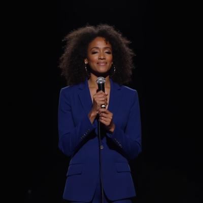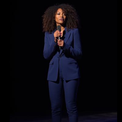 Женщина темнокожая брюнетка с кудрявыми волосами 25 лет на чёрном фоне с микрофоном в руках в синем строгом костюмевыступает на сцене она певица концерт