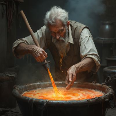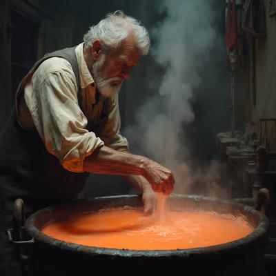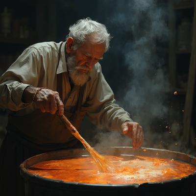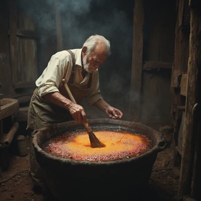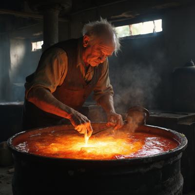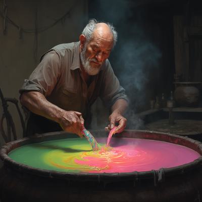 Старик мешает в большом чане разноцветную жижу