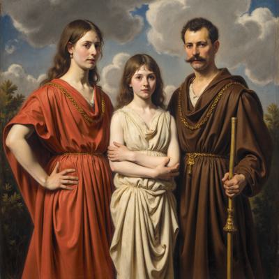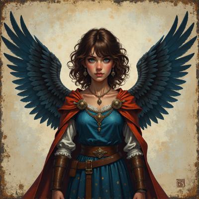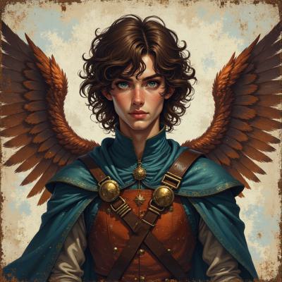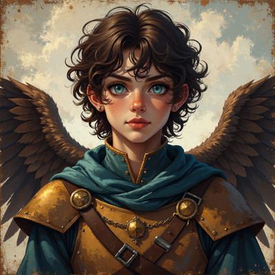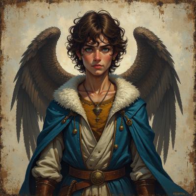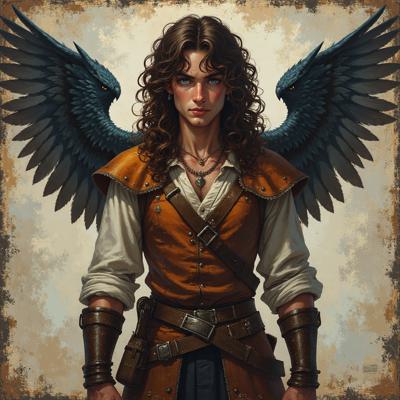 Мужчина в анфас по плечи. На однотонном потертом фоне. Мужчина. Каштановые вьющиеся волосы, челка спадает на глаза. Голубые глаза. Одет как средневековый воин. Крылья в цвет волос, аккуратно сложены за спиной, похоже на птичьи с перьями