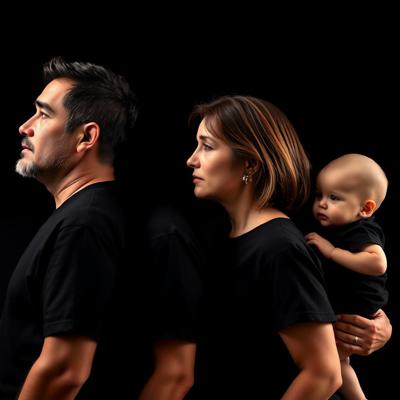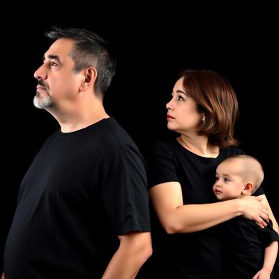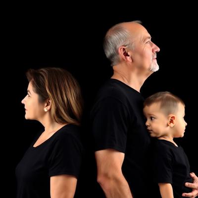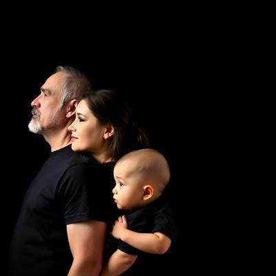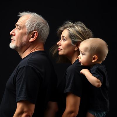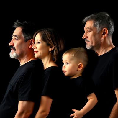 Портрет поколений, четыре человека , люди стоят в профиль слева направо, смотрят в одну сторону. Мужчина, женщина, мальчик, малыш изображены на чёрном фоне. Освещение мягкое, подчёркивающее черты лиц. Все одеты в чёрные однотонные футболки, лица расположены близко друг к другу, создавая ощущение единства и преемственности. Не меняй и не искажай лица , нужно полностью сохранить черты лица людей , как в оригинале.