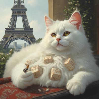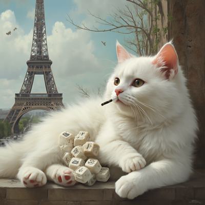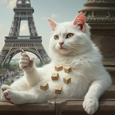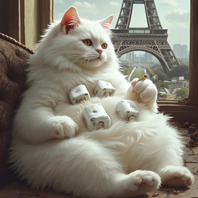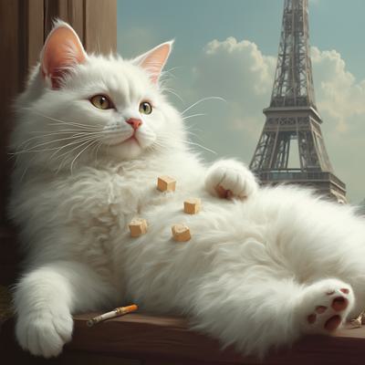 белый красивый лохматый кот с шестью кубиками на животе лежит на фоне Эйфелевей башни с рукой держащую сигарету. картинка в стиле реализма, с множеством красивых и проработанных деталей