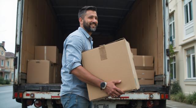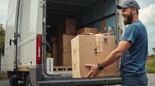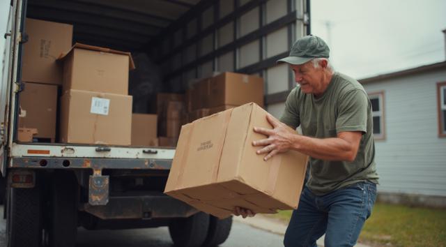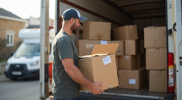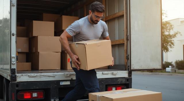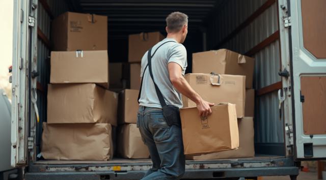мужчина разгружает коробки из грузового автомобиля