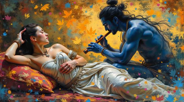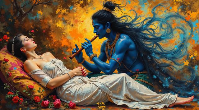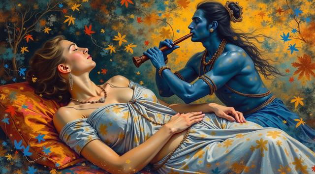 СРЕДНЕВЕКОВАЯ КАРТИНА ЖЕНЩИНА СПИТ СИДЯ СКЛОНИЛАСЬ НА БОК ОБЛАЧЕНА В СЕРЕБРЯННУЮ ПАРЧУ С ОРНАМЕНТАМИ НАД НЕЙ ИНДИЙСКОЕ СИНЕЕ БОЖЕСТВО ИГРАЕТ НА ФЛЕЙТЕ МЕЖДУ ЖЕНЩИНОЙ И БОЖЕСТВОМ АБСТРАКТНЫЙ ФОН В ВИДЕ СИЛУЭТА ЧЕЛОВЕКА С НЕБОЛЬШИМ БОБАВЛЕНИЕМ РАСТИТЕЛЬНОСТИ