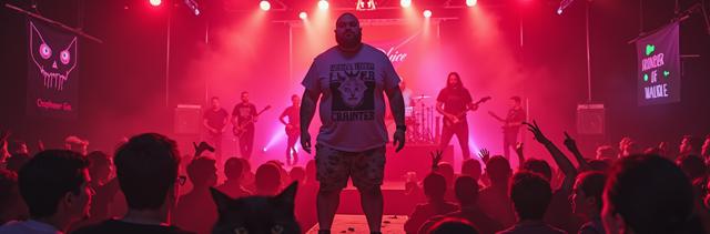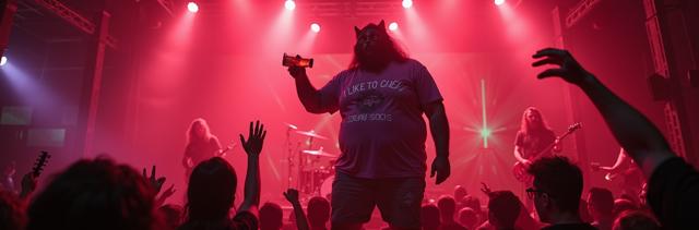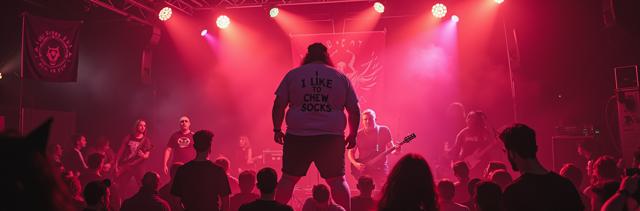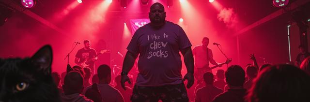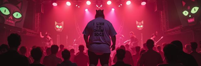 Толстяк в сиреневой футболке с надписью Я ЛЮБЛЮ ЖЕВАТЬ НОСКИ и трусах-кот стоит на концерте и пьёт пиво, слэм, мош, красный туман вокруг, дэткор-группа играет на сцене, флаг CHAMBER OF MALICE на сцене, лампы в виде сиреневых и зелёных глаз на потолке, мусор кругом, микрофон в виде черепа, инопланетянин среди людей, светомузыка, яркие краски, лавкравтовские ужасы