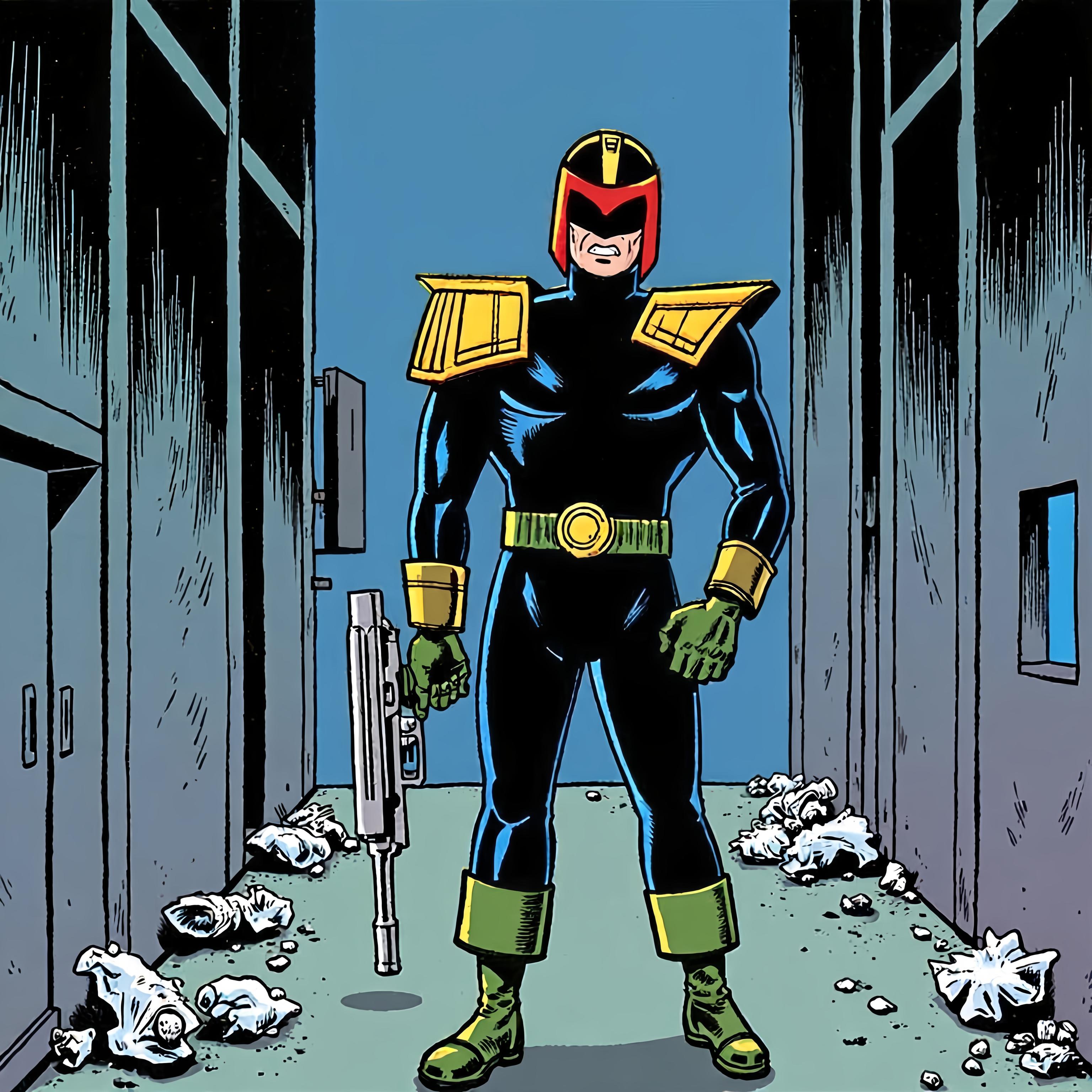 Удали жёлтый пузырь комикса [Качество x3 [Уточнение для #6273975 'Удали пущыри комикса [Уточнение для #6273971 'Judge Dredd судья Дредд стоит в переулке, держит пистолет. Красно-чёрный шлем. Чёрный визор. Золотые наплечники, значок. Чёрная униформа. Зелёные перчатки, зелёная обувь. Серая дубинка на поясе. Ночь. Мегаполис, фантастика, киберпанк, подворотня, переулок, мусор, неон. 2d, реализм, комикс, анимешная стилистика, акварель, маркеры, гуашь, масляные краски, тушь, цветные карандаши, пастель фэнтези. арт, скетч [Качество x3 ]]']']