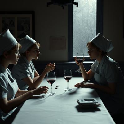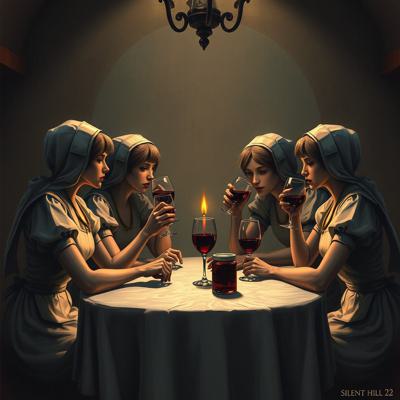 медсестры из игры silent hill 2 сидят за столом и пьют вино