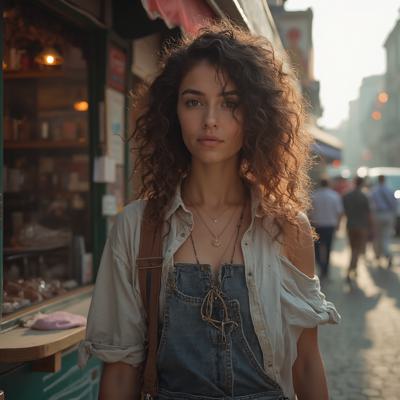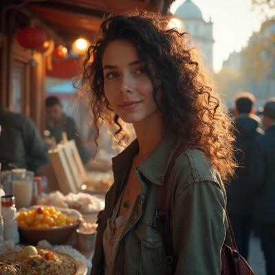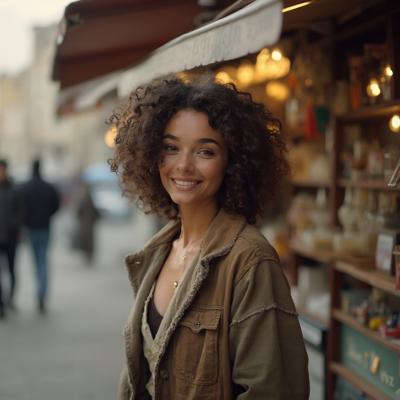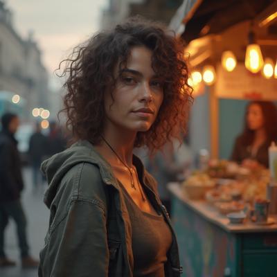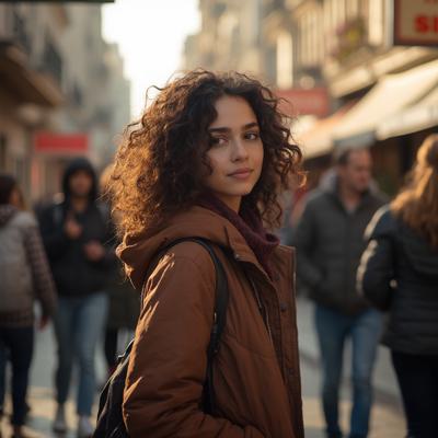Женщина брюнетка 24 лет с кудрвыми волосами одета в обычную одежду около стенда рано утром