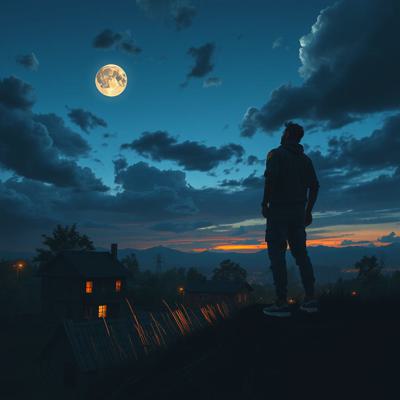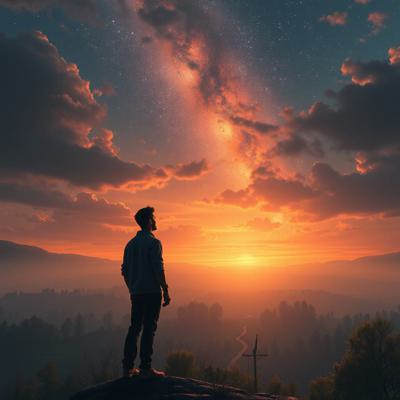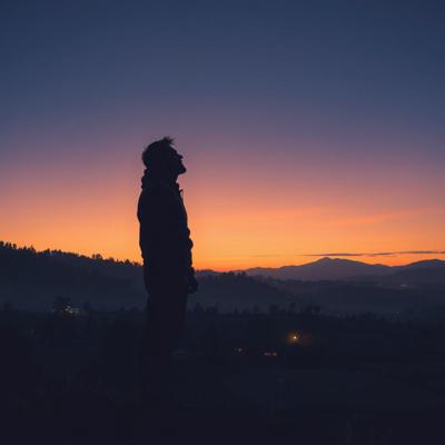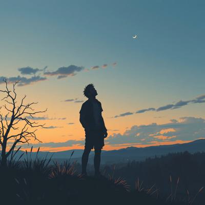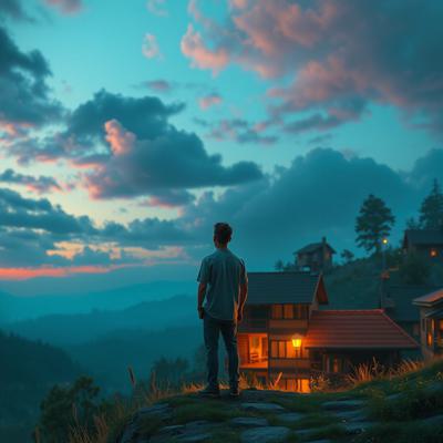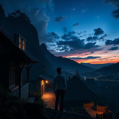 Вечер, парень стоит на краю деревни и смотрит в небо