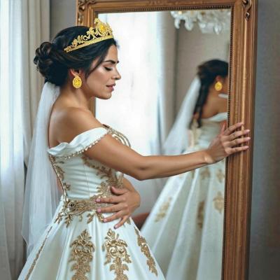 сделать девушке возраст 22 года [Уточнение для #6215069 'Сделать девушку моложе [Уточнение для #6215012 'Размыть изображение в зеркале. Надеть на голову диадему из желтых драгоценных камней, в уши золотые сережки с желтыми камнями. [Уточнение для #6215006 'Убрать фату. Сделать на руке на животе пять пальцев. [Уточнение для #6214995 'Левую руку положить на живот. Убрать свисающую косу и фату. [Уточнение для #6214994 'Одной рукой упирается в раму зеркала, другая рука лежит на животе. Девушка слегка согнута, хмурится от боли. [Уточнени