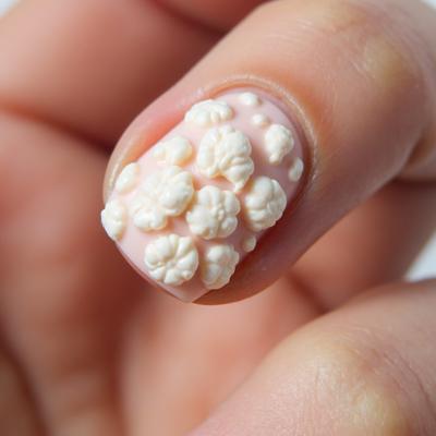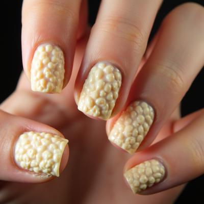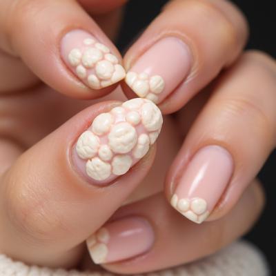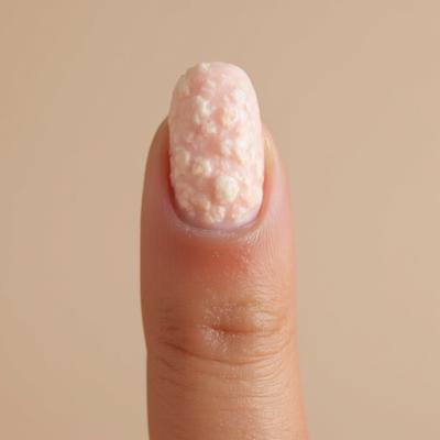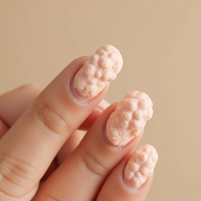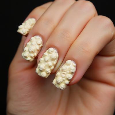 Macro close-up of a female hand. Nails have a thick, textured gel coating that mimics the bumpy, irregular, puffy surface of popcorn — rounded raised bumps, deep crevices, chaotic organic pattern, but the nails keep their natural shape and length. Not food, just texture. Glossy highlights on the bumps. Base color soft milky pink. Clean pastel cream background. Natural diffused studio lighting, photorealistic, hyper-detailed, 8k.