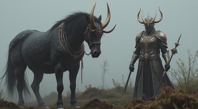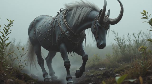 Лошадь с рогами друид на четрых копытах. Земли, травы, лозы.