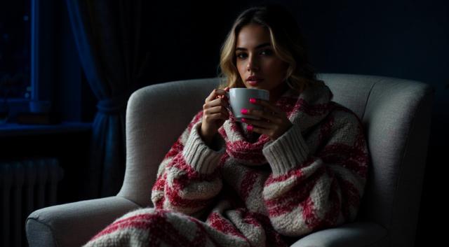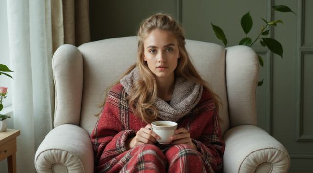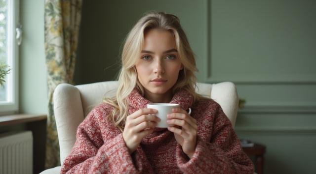 Девушка красивая славянка высокая 22 лет, грудь 3 размер красивое лицо, Блондинка; сидит укрытая в плед красно белый в белом кресле, укрыла ноги, а в руках попивая чай из чашки, сзади фон светлозеленых тонов стены спокойного дома, находясь внутри него, фото сбоку от нее чуть подальше она не смотрит в кадр а куда то в свою сторону будто не замечая фотку, свет приглушен. ФОТО СБОКУ ИЗДАЛИ МЕТРОВ С 7. ВРЕМЯ В КОМНАТЕ ВЕЧЕРНЕЕ ТО ЕСТЬ СВЕТ ПРИГЛУШЕН ФОН ЕСЛИ ОН ЕСТЬ ТЕМНЫЙ ЗА ОКНОМ