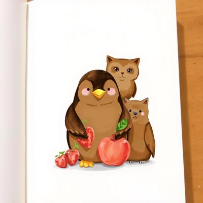 Сова должна быть коричневая [Уточнение для #6275869 'Акварельная иллюстрация. Пингвин с клубникой, белая кошка с яблоком и сова. Мягкие пастельные тона, нежные мазки кисти, белый фон с легкими тенями, стиль книжной иллюстрации, элегантно, минималистичная композиция., ]'