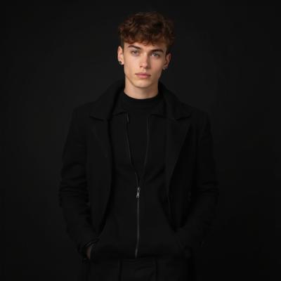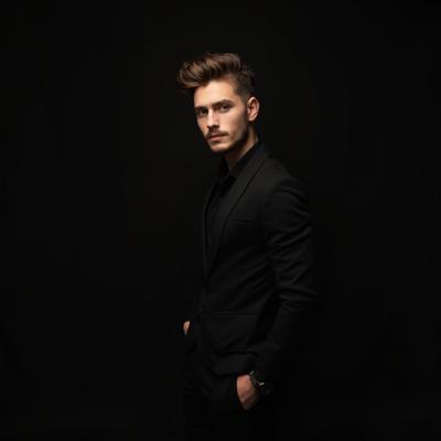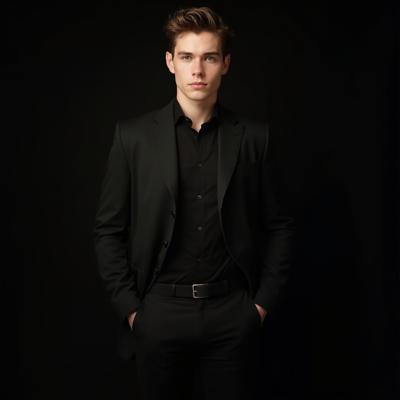 Молодой Мужчина шатен 25 лет одет в чёрный пиджак и чёрные брюки на у стены на чёрном фоне причёска французский кроп, дерзкий, рост 174, вес 72,тело подтянутое, красивое