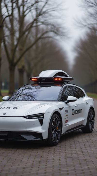 квант мобиль корпоративное авто в стиле бетмобиля, но белого цвета с фирменными элементами