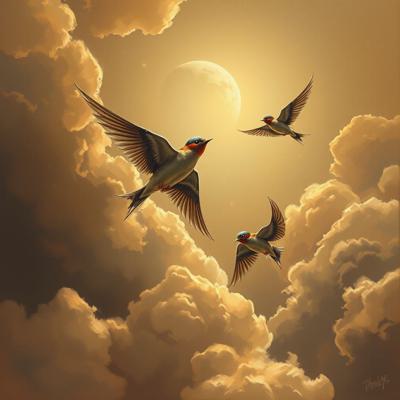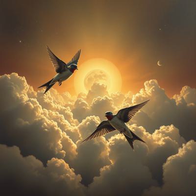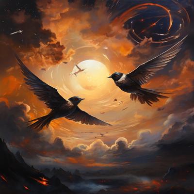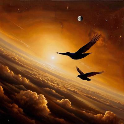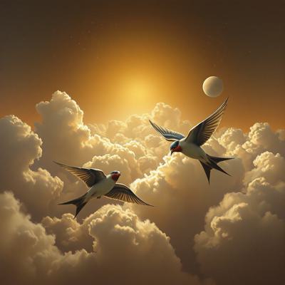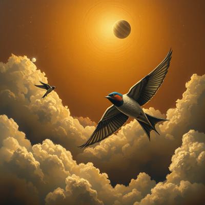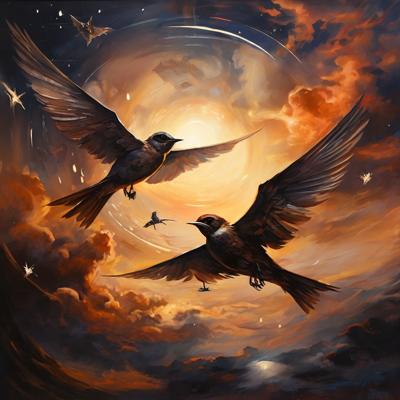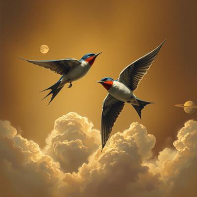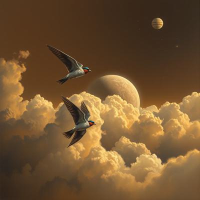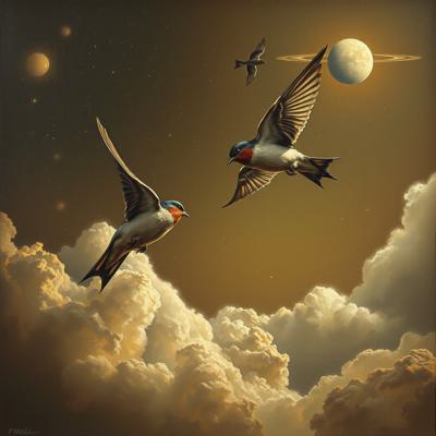 две ласточки летят друг за другом в фантастическом коричневом небе, за облаками видны звезды и планета, ласточки летят по спирали на верх. крупным планом. живопись маслом. киберпанк.