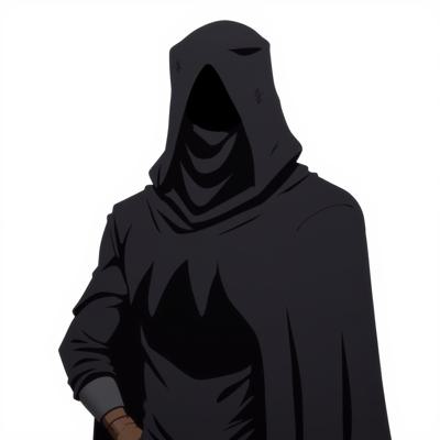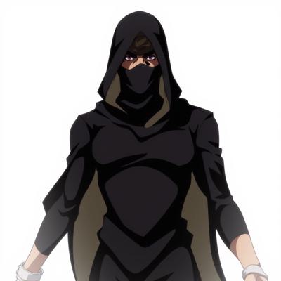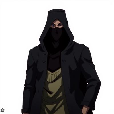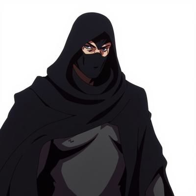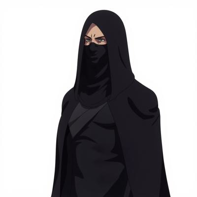 Мужчина в черной одежде и капишоне что закрывает полностью лицо, в арабской одежде и похож на авантюриста на белом фоне