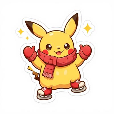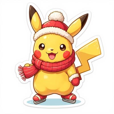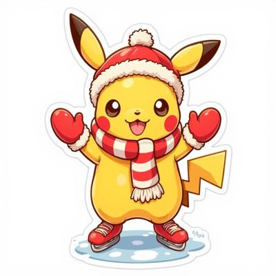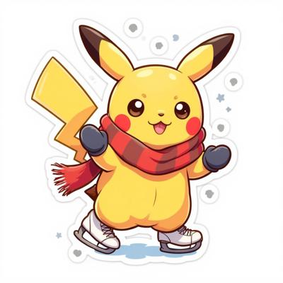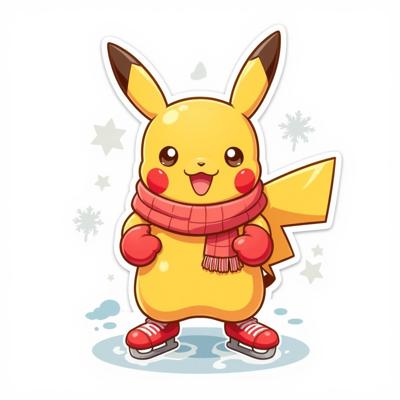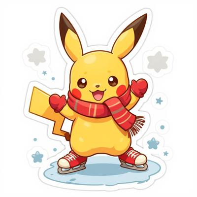 Пикачу в зимних варежках, в шарфике и на коньках, на белом фоне